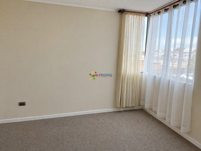 Arrienda Precioso Departamento en condominio cerrado, ubicado en segundo piso. La propiedad cuenta con las siguientes características: Acceso principal, living comedor, cocina americana, amplios ventanales, 2 dormitorios, baño completo y terraza. Adicionalmente cuenta con lavadero, estacionamiento y citófono a conserjería. Accesos controlados, estacionamiento bicicletas. Ubicación privilegiada a pasos de todos los servicios que ofrece el sector como supermercado Jumbo, Easy, colegios, servicentros, Inacap y una locomoción excelente.